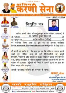 क्षत्रिय करणी सेना परिवार (एकीकृत क्षत्रिय परिवार भारतवर्ष) ने छत्तीसगढ़ में अपने संगठन को मजबूती प्रदान करने के उद्देश्य से नई नियुक्तियों की घोषणा की है। इसी कड़ी में, मूल रूप से चिरमिरी (पोड़ी) के निवासी और वर्तमान में रायपुर में सक्रिय कुशल युवा व्यवसाई श्री फनिक सिंह को संगठन में प्रदेश सचिव (वरिष्ठ) के महत्वपूर्ण पद पर मनोनीत किया गया है। संगठन द्वारा जारी आधिकारिक पत्र के अनुसार, श्री फनिक सिंह की यह नियुक्ति 05 फरवरी, 2026 से प्रभावी हो गई है। उनका यह कार्यकाल 05 फरवरी, 2027 तक, एक वर्ष की अवधि के लिए रहेगा। प्रदेश अध्यक्ष (छत्तीसगढ़) श्री अभिषेक कुमार सिंह के हस्ताक्षरों से यह नियुक्ति पत्र जारी किया गया है।